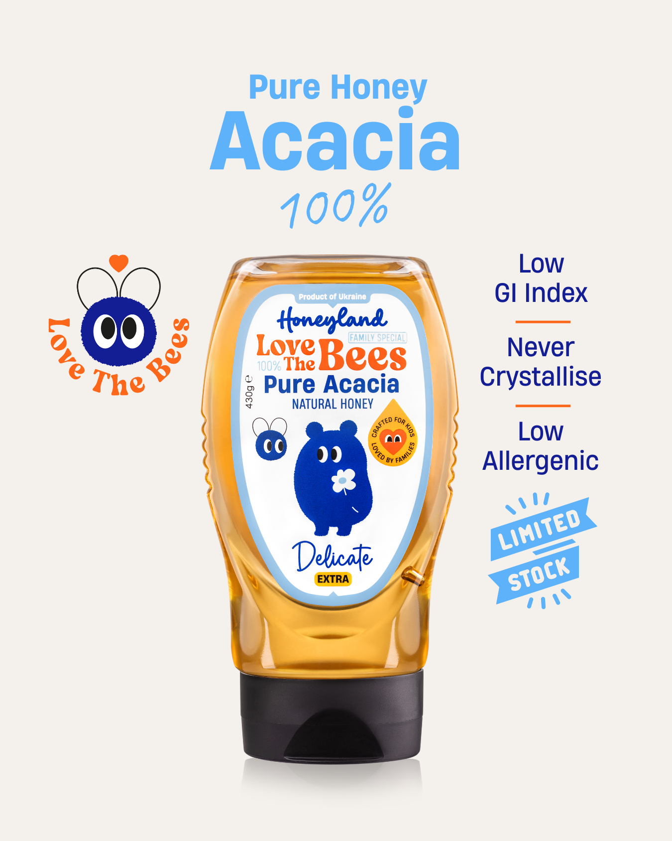 100% pure Ukrainian acacia honey – light, floral and naturally slow to crystallise. Crafted for kids, loved by families.